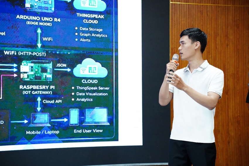 Trong khi đó, dự án Smart Plant Management của SV Lê Nguyễn Anh Nhi (Lớp 24VDT) tập trung xây dựng hệ thống theo dõi và tưới cây tự động. Dù chưa có nhiều kinh nghiệm về phần cứng trước đó, Nhi vẫn hoàn thành sản phẩm đúng tiến độ nhờ tinh thần hợp tác tích cực trong nhóm quốc tế.