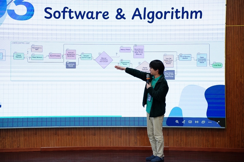 Ở dự án Robot phát hiện và tiếp cận đám cháy, SV Lê Công Trường (Lớp 23DT4) cùng hai sinh viên Nhật Bản đã xây dựng robot tích hợp ba cảm biến lửa, điều khiển bởi Arduino Uno R4 WiFi, có khả năng tự động xác định và tiếp cận nguồn nhiệt. “Qua chương trình, em rèn luyện được tư duy giải quyết vấn đề và tự tin hơn khi trình bày ý tưởng trước hội đồng quốc tế”. Trường cho biết.